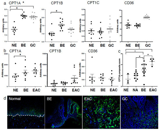 Expression of CPT1A is increased in the sequence from normal esophageal squamous epithelium to BE and EAC. (a) Comparison of CPT1 component expression and CD36 between normal esophagus (NE), Barrett’s esophagus (BE) and gastric cardia (GC) using the GSE34619 dataset (8 patients normal squamous, 10 with BE and 10 gastric cardia). * p < 0.05 Student’s t-test (b). Expression of CPT1A, CPT1B and CD36 in normal esophagus (NE), Barrett’s esophagus (BE) and esophageal adenocarcinoma (EAC) tissues in the publically available dataset GDS1321/GSE1420;8 patients with Barrett’s associated adenocarcinomas. (c) Composite score and quantification of immunofluorescent staining using antibody against CPT1A in normal esophagus (NE), Barrett’s esophagus (BE) and esophageal adenocarcinoma (EAC) and matching normal adjacent tissues (NA). (d) Representative images of CPT1A immunofluorescence staining. * p < 0.05, Student’s t-test.