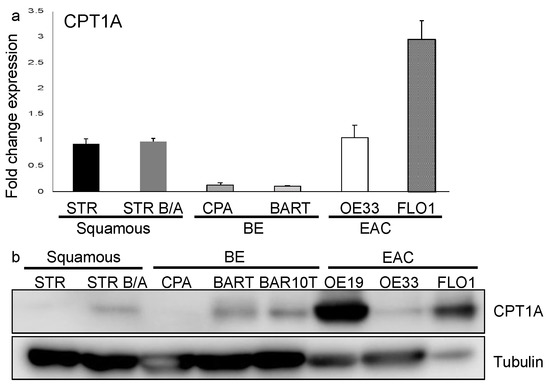 CPT1A is expressed in the esophagus and protein upregulated in the progression to EAC. (a) qRT-PCR with primers for CPT1A amplification was performed using RNA extracted from normal immortalized esophageal keratinocytes (STR), bile/acid-tolerant STRs, the Barrett’s esophagus cell lines, CPA and BAR-T, as well as esophageal adenocarcinoma cell lines (OE33 and FLO1) was evaluated. RNA expression is increased in EAC cells. (b) Protein was extracted from cell lysates and detected with antibody against CPT1A by Western Blot, showing an increased expression in bile/acid-tolerant STRs, BAR-T and BAR10T as well as EAC cell lines (OE19, OE33 and FLO1) compared to normal.