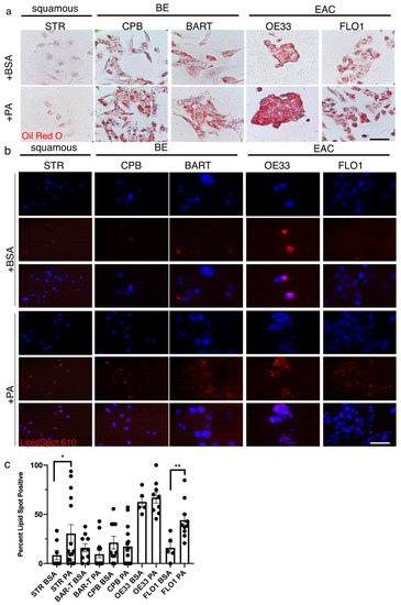 Palmitic acid uptake can be detected in esophageal epithelial cells. (a) The Oil Red O stain shows a general presence of lipids in STR, CPB and BAR-T cells as well as the EAC cell lines, OE33 and FLO1. (b) The fluorescent red signal using LipidSpotTM for the detection of neutral lipids is observed in the BE cell lines, CPB and BAR-T, and EAC cells, OE33 and FLO1 after treatment with 30 µM palmitic acid for 90 min compared to BSA control, DAPI for nuclear stain. (c) Lipidspot-positive cells were counted per field and compared to total nuclei for quantification. * p < 0.05, ** p < 0.01, t-test with Welch’s correction.