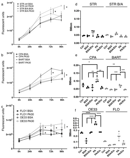 Palmitic acid promotes proliferation and increases the capacity for colony formation in EAC. Cell proliferation was determined using the CellTiter assay showing that stimulation with 30 µM palmitic assay increases growth significantly compared to BSA control in bile/acid-tolerant STR but not normal esophageal STR (a). (b) The proliferation of BE cell lines, CPA and BAR-T, is enhanced with 30 µM palmitic acid, so is cell growth in esophageal adenocarcinoma cell lines compared to BSA control (c). Crystal violet stain was quantified for colony formation of STR and STR B/A (d), BE (e) and EAC (f) cell lines. STR and STR B/A did not form measurable colonies, but colony formation is significantly increased in CPA, BAR-T and OE33 cells upon stimulation with 30 µM PA. There is a trend for augmented colony formation in the FLO cells, but it is not significant. * p < 0.05; ** p < 0.01; *** p < 0.001; **** p < 0.0001.