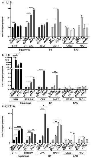 PA stimulates IL1B, IL8 and CPT1A and upregulation in the progression to EAC. RNA expression was determined by qRT-PCR with primers for the inflammatory cytokines IL1B and IL8 and CPT1A. (a) Palmitic acid increased the expression of IL1B in bile/acid-tolerant STRs and BAR-T cells. Etomoxir only inhibits PA-dependent increased expression in BAR-T. (b) IL8 expression is increased in a PA-dependent manner in BE cell lines and inhibited by etomoxir. (c) CPT1A is increased in response to PA stimulation in STR, CPA, and BAR-T cells. Etomoxir only reverses the increase in CPA cells. * p < 0.05, ** p < 0.01, *** p < 0.001, **** p < 0.0001, One-way ANOVA.