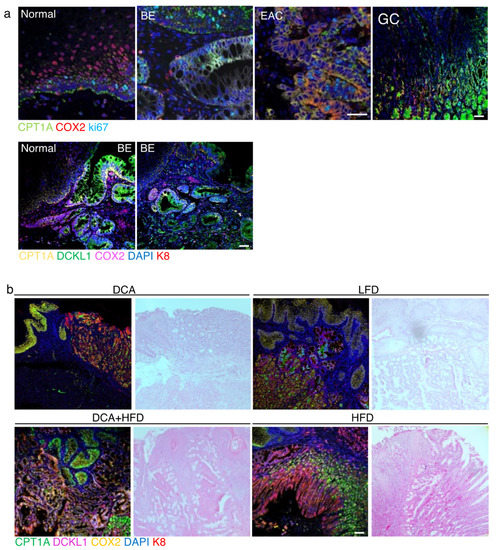 CPT1A upregulation correlates with an increase in COX2 and DCLK1 in human and mouse. (a) Human biospecimen from normal, Barrett’s (BE), esophageal adenocarcinoma (EAC) and gastric cardia were stained with antibody against CPT1A, COX2 and ki67. CPT1A and COX2 expression are increased in BE, EAC as is ki67. In biopsies capturing the junction of healthy squamous and BE, the increase in CPT1A and the stemness marker DCLK1 localize to the BE lesion, also identified with K8 using multiplex immunofluorescence staining. (b) ED-L2- IL1β mice were exposed to deoxycholate (DCA) in the drinking water, low fat diet (LFD) or high fat diet (HFD) alone and in combination with DCA. The combination treatment results in a high signal for the detection of CPT1A, DCLK1 and COX2 in K8-positive BE-like regions. Scale bar, 50 microns.