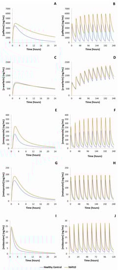 Representative mean simulated concentration-time profiles of probe substrates metabolised by each of the major cytochrome P450 enzymes. Blue line represents healthy control population, orange line represents MAFLD populations. (A): caffeine (CYP1A2), single dose; (B): caffeine, multiple doses; (C): s-warfarin (CYP2C9), single dose; (D): s-warfarin, multiple doses; (E): omeprazole (CYP2C19), single dose; (F): omeprazole, multiple doses; (G): metoprolol (CYP2D6), single dose; (H): metoprolol, multiple doses, (I): midazolam (CYP3A4), single dose; (J): midazolam, multiple doses.