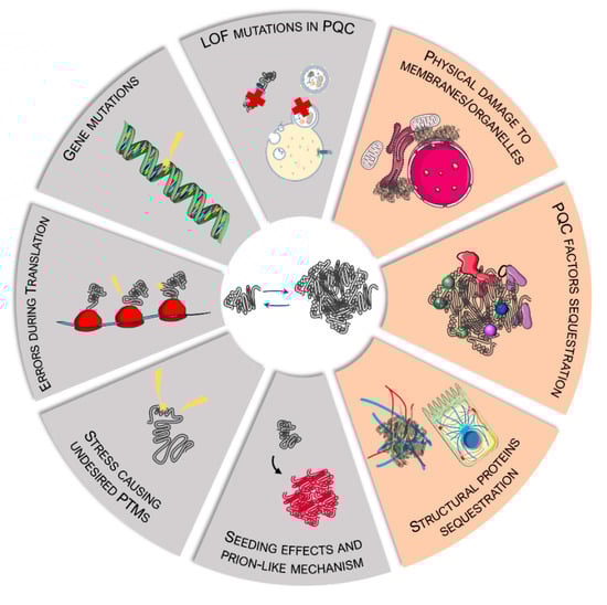 Mechanisms and consequences of protein misfolding and aggregation. In grey, mechanisms that directly or indirectly cause protein misfolding and accumulation into aggregates. In orange, the main damaging effects of misfolded proteins and aggregates on cell homeostasis. LOF = loss of function; PQC = protein quality control; PTMs = post-translational modifications. This figure was created using Servier Medical Art templates, which are licensed under a Creative Commons Attribution 3.0 Unported License; https://smart.servier.com (accessed on 12 October 2021).