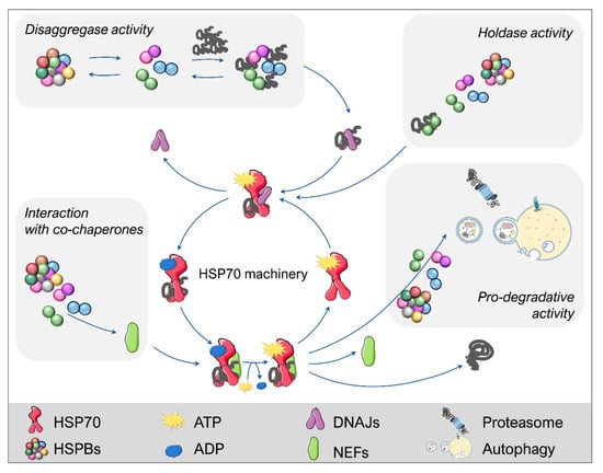 HSPBs participation in the PQC system. The HSP70 machinery is the core system of the proteostasis network. HSP70s perform folding cycles using ATP and collaborating with other chaperones (e.g., DNAJs) and co-chaperones, such as NEFs. HSPBs directly or indirectly interplay with HSP70 by exerting a disaggregase activity and by keeping client proteins in a refolding-competent state (holdase activity). Additionally, some HSPBs cooperate with co-chaperones and/or facilitate the routing of client proteins to degradation, which can occur through autophagy and the proteasome. This figure was created using Servier Medical Art templates, which are licensed under a Creative Commons Attribution 3.0 Unported License; https://smart.servier.com (accessed on 12 October 2021).