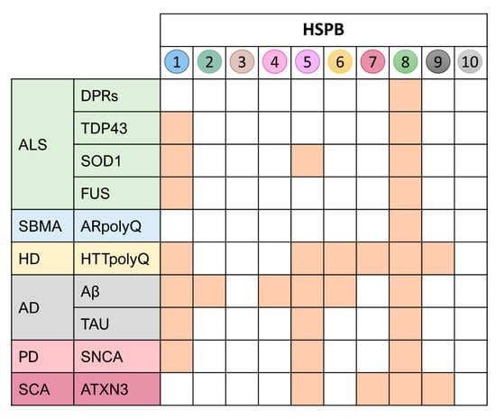 HSPBs anti-aggregating and/or pro-degradative functions against MND/ND substrates. This graph outlines the substrates against which HSPBs have been found to exert their activity (orange squares).