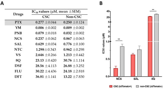 Selective anti-CSC activity of screened drugs in CSC and non-CSC MDA-MB-231 cells grown under attachment conditions. (A) IC50 values for each compound in both subpopulations after 72 h of incubation. (B) Representation of IC50 of compounds that showed a greater cytotoxic effect against CSCs compared to non-CSCs. Differences were statistically significant (** p < 0.01) when comparing IC50 values of 8Q and NCS between both cell subpopulations, but not in the case of SAL. Data are represented as the mean ± SEM of three independent experiments.