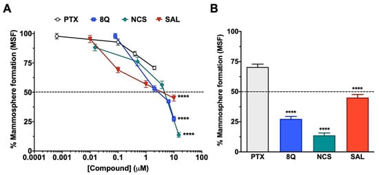 Anti-CSC activity of selected compounds in the MDA-MB-231 CSC population cultured under low attachment conditions. (A) Dose-response curves of the CSC mammosphere-forming efficiency (MSF) of MDA-MB-231 cells after drug treatments. (B) Percentage of mammosphere after 7-day incubation with 2 µM PTX, 10 µM SAL and 8Q, and 15 µM NCS. Statistically significant results were obtained for all tested compounds when compared to PTX. Data are represented as the mean ± SEM of three independent experiments. **** p < 0.0001.