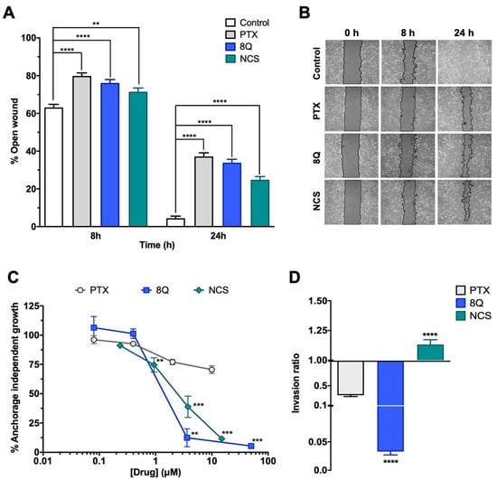 We next examined whether 8Q and NCS impacted other distinctive features of CSCs, including migration, anchorage-independent growth (neoplastic transformation) and cell invasion ability, using the MDA-MB-231 cell line (Figure 3). Regarding migration, significantly lower wound closure was observed in cells treated with anti-CSC drugs compared to the controls (Figure 3A,B). At 24 h, the open wound detected for the control samples was almost minimal (4.45% ± 1.12%), while in cells treated with 8Q and NCS, it was 33.9% ± 1.8% and 24.9% ± 1.7%, respectively (Figure 3A). Of note, treatment with PTX also showed a high inhibitory effect on cell migration (Figure 3A,B). Interestingly, anchorage-independent growth of MDA-MB-231 cells in soft agar was significantly inhibited by treatments with 8Q and NCS (Figure 3C). At the highest tested concentrations of 8Q (50 µM) and NCS (15 µM), the capacity of malignant cells to form colonies was significantly reduced to 5.40% ± 1.23% and 11.48% ± 1.11% of the growth observed in the non-treated cells, respectively. Conversely, PTX treatment was not able to reduce the anchorage-independent growth below 50%, thereby demonstrating that 8Q and NCS had superior anti-CSC activity (Figure 3C).
