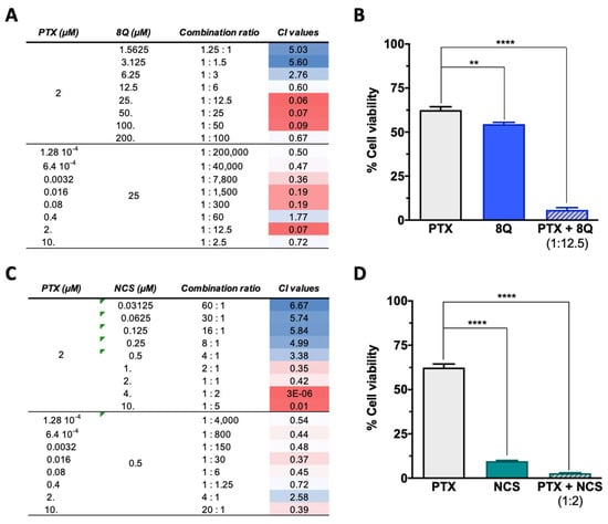 Effect of the combination of 8Q and NCS with PTX on the cell viability of MDA-MB-231 cells. (A) Combination index (CI) of different PTX to 8Q drug ratios, shown as heat maps (CI > 1 indicating antagonism in blue, CI < 1 showing synergism in red). Studies were done fixing the PTX concentration first at its IC50 value (2 µM) and changing the 8Q concentration (top values), fixing the 8Q concentration at its IC50 value (25 µM) and varying the PTX concentration (bottom values). (B) Viability of MDA-MB-231 cells treated with PTX, 8Q or the 1:12.5 PTX:8Q ratio. (C) CI of different PTX to NCS ratios, again fixing first the PTX at its IC50 value (2 µM) and changing the NCS concentration (IC50 value 0.5 µM) and vice versa (lower part of the table). (D) Viability of MDA-MB-231 cells treated with PTX, NCS or the 1:2 PTX:NCS ratio. Data are represented as the mean ± SEM of three independent experiments (** p < 0.01, **** p < 0.0001).