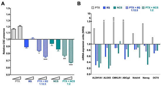 Anti-CSC activity of 8Q and NCS in combination with PTX in the MDA-MB-231 fluorescent CSC model. (A) Relative CSC-tdTomato+ presence determined by flow cytometry and referred to control condition. Values below than, equal to or above 1 indicate reduction, maintenance or increase of CSC-tdTomato+ cells within population, respectively. Data are represented as the mean ± SEM of three independent experiments. Statistic t-test analyses were performed to compare drug combinations with single anti-CSC drug treatments at the corresponding equivalent drug dose (* p < 0.05, *** p < 0.001, **** p < 0.0001). (B) Changes in the stem cell gene expression profile determined by quantitative RT-PCR. Results are expressed as normalized relative quantities (NRQ) and referred to as control conditions. Concentrations tested for drugs were 0.5 and 1 μM for PTX, 6.25 and 12.5 μM for 8Q, 1 and 2 μM for NCS and the corresponding combined ratios.