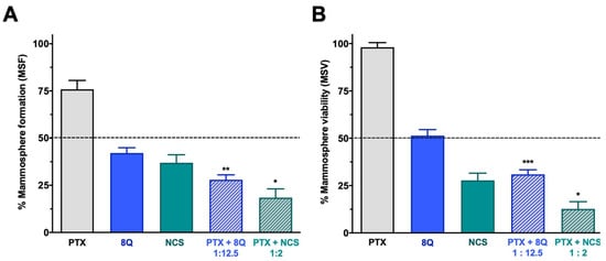 Effect of the combination of 8Q or NCS with PTX in MDA-MB-231 mammospheres. (A) Mammosphere-forming (MSF) efficiency of PTX, 8Q, NCS and their combination (2 μM, 25 μM and 4 μM, respectively). (B) Mammosphere viability (MSV) of PTX, 8Q, NCS and their combination (4 μM, 50 μM and 8 μM, respectively). Results are represented as the mean ± SEM of three independent experiments and referred to as the non-treated control condition. Statistical t-test analysis was performed comparing combination therapy with single anti-CSC treatments at the corresponding equivalent drug dose (* p < 0.05, ** p < 0.01, *** p < 0.001).