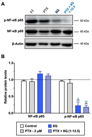 Effect of 8Q and PTX treatments on the NF-κB signaling pathway in MDA-MB-231 cells. (A) Representative Western blots of total and phosphorylated NF-κB p65 protein levels upon treatment with PTX, 8Q or their combination (2 μM and 25 μM, respectively). The β-actin protein expression level was used as a loading control. (B) Quantification of band intensity in Western blots. The results are expressed as normalized protein levels, referred to β-actin expression, represented as mean ± SEM of three independent experiments. Statistic t-test analysis of 8Q and combined therapy was done in comparison with control non-treated cells (black asterisks, ** p < 0.01) as well as with PTX treatment (blue asterisks, * p < 0.05 and ** p < 0.01).