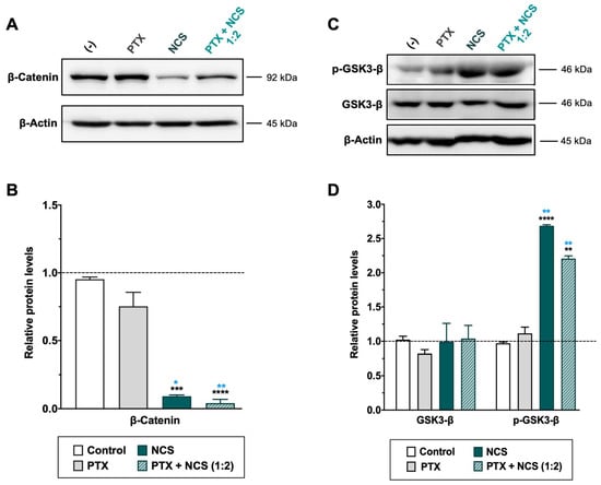 Effect of NCS and PTX treatments in the Wnt/β-Catenin signaling pathway in MDA-MB-231 cells. β-Catenin, total- and phosphorylated-GSK3-β protein levels expression levels after PTX and NCS treatment, both alone and in combination (1:2 ratio), were determined. (A–C) Representative β-Catenin and GSK3-β protein levels after drug treatments. The β-actin protein expression level was used as a loading control. (B–D) Graphs represent the quantification band intensity signal referred to β-actin expression, represented as mean ± SEM of three independent experiments. Statistic t-test analysis of NCS and combined therapy was performed in comparison with control non-treated cells (black asterisks, ** p < 0.01, *** p < 0.001 and **** p < 0.0001) as well as with PTX treatment (blue asterisks, * p < 0.05 and ** p < 0.01).