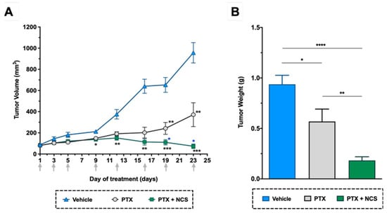 In vivo efficacy of PTX in combination with NCS in mice with orthotopic MDA-MB-231 tumors. (A) Tumor volume measurements in the study groups during treatment. (B) Tumor weights at the end of the experiment. Arrows indicate treatment points. The results are represented as the mean ± SEM in both graphs (animals/group ≥ 6). Statistic t-test analyses of combined treatment were performed in comparison with vehicle (black) as well as with PTX single treatment (blue). In all cases, * p < 0.05, ** p < 0.01, *** p < 0.001 and **** p < 0.0001.
