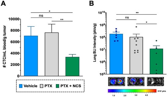 Effect of the PTX-NCS combination on CTC and lung metastasis. (A) Quantification of plasma circulating tumor cells (CTCs) isolated from the bloodstream of MDA-MB-231 tumor-bearing mice and further analyzed by flow cytometry. The results are represented as the number of CTC events (mean ± SEM) per mL of blood collected and further normalized per gram of tumor (n ≥ 6). A statistic t-test analysis was performed to compare the results between the study groups. (B) Quantification of BLI signal intensity from mice lungs of all three study groups. Results are expressed as the mean ± SEM of the BLI signal (ph/s) per gram of lung tissue (n ≥ 6). Statistical Mann–Whitney analysis was performed comparing the results between the study groups. Representative BLI images of excised mice lungs from all three study groups at endpoint necropsy are also shown. Bioluminescent signals were analyzed by ex vivo imaging using the IVIS Spectrum and further quantified using Living Image® 4.5.2 software. Statistical significance is shown as ns p > 0.05, * p < 0.05, and ** p < 0.01.