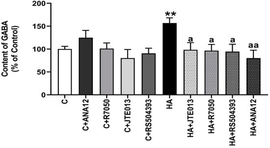 Hyperammonemia increases the content of GABA in cerebellar slices. Ex vivo treatment with ANA12, R7050, JTE-013, or RS504393 reverses the increase in GABA. HPLC was performed as indicated in Section 4. Values are the mean ± SEM of 12–16 rats per group. Values significantly different from control rats are indicated with asterisks, and from hyperammonemic rats are indicated with “a”. ** p < 0.01; a p < 0.05, aa p < 0.01. F = 3.628. Data were analyzed using one-way analysis of variance (ANOVA) followed by Tukey’s post hoc test.