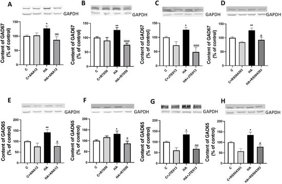 Hyperammonemia increases the content of GAD67 (A–D) and GAD65 (E–H) in cerebellar slices. Ex vivo treatment with ANA12, R7050, JTE-013, or RS504393 reverses these increases. Western blot was performed as indicated in Section 4. Values are the mean ± SEM of 19–24 rats per group. Values significantly different from control rats are indicated with asterisks, and from hyperammonemic rats are indicated with “a”. * p < 0.05; ** p < 0.01; a p < 0.05, aa p < 0.01; aaa p < 0.001. (A–H) F values were 4.450, 7.968, 9.863, 5.499, 6.864, 3.683, 7.582, and 7.051, respectively. Data were analyzed using one-way analysis of variance (ANOVA) followed by Tukey’s post hoc test.