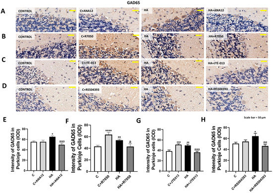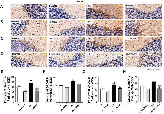GAD67 content increased in the Purkinje neurons of hyperammonemic rats. Ex vivo treatment with ANA12, R7050, JTE-013, or RS504393 reversed this increase. (A–D) Immunohistochemistry was performed as indicated in Section 4, with DAB staining using antibodies against GAD67. Representative images are shown. (E–H) GAD67 content was quantified in Purkinje cells as described in Section 4. Values are the mean ± SEM of 8 rats per group. Values significantly different from control rats are indicated with asterisks, and from hyperammonemic rats are indicated with “a”. * p < 0.05, ** p < 0.01, *** p < 0.001, **** p < 0.0001; a p < 0.05, aaa p < 0.001, aaaa p < 0.0001. (E–H) F values were 35.26, 5.622, 9.090, and 8.133, -respectively. Data were analyzed using one-way analysis of variance (ANOVA) followed by Tukey’s post hoc test.