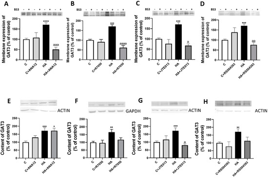 Hyperammonemia increases the membrane expression and total content of GAT3. Ex vivo treatment with ANA12, R7050, JTE-013 or RS504393 reverses most of these increases. (A–D) Membrane expression of GAT3 was analyzed using the BS3 cross-linker procedure in slices from control (C) and hyperammonemic (HA) rats. The effects of blocking TrkB with TrkB with ANA12, TNFR1 with R7050, S1PR2 with JTE-013, and CCR2 with RS504393 on the membrane expression of GAT3 are also shown. (E–H) Total GAT3 content was analyzed with Western blot in slices from control and hyperammonemic rats treated or not with ANA12, R7050, JTE-013, and RS504393. Actin or GAPDH was used as the loading control. Values are the mean ± SEM of (A–D) 23–32 rats and (E–H) 17–25 rats per group. Values significantly different from control rats are indicated with asterisks, and from hyperammonemic rats are indicated with “a”. * p < 0.05, ** p < 0.01, *** p < 0.001, **** p < 0.0001; a p < 0.05, aa p < 0.01, aaa p < 0.001, aaaa p < 0.0001. (A–H) F values were 8.691, 14.13, 8.873, 7.979, 7.813, 5.912, 6.499, and 6.537, respectively. Data were analyzed using one-way analysis of variance (ANOVA) followed by Tukey’s post hoc test.