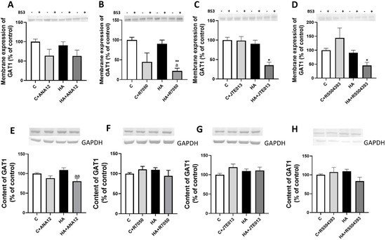 Hyperammonemia does not affect the membrane expression and content of GAT1. (A–D) The membrane expression of GAT1 was analyzed using a BS3 cross-linker procedure in slices from control (C) and hyperammonemic (HA) rats. The effects of blocking TrkB with ANA12, TNFR1 with R7050, S1PR2 with JTE-013, and CCR2 with RS504393 on the membrane expression of GAT1 are also shown. (E–H) Total content of GAT1 was analyzed with Western blot in slices from control and hyperammonemic rats treated or not with ANA12, R7050, JTE-013, and RS504393. Actin or GAPDH were used as the loading control. Values are the mean ± SEM of (A–D) 23–32 rats and (E–H) 17–25 rats per group. Values significantly different from control rats are indicated with asterisks, and from hyperammonemic rats are indicated with “a”. * p < 0.05, ** p < 0.01; a p < 0.05, aa p < 0.01. (A–H) F values were 2.681, 6.521, 2.793, 5.908, 5.711, 1.371, 1.371, 1.536, and 2.566, respectively. Data were analyzed using one-way analysis of variance (ANOVA) followed by Tukey’s post hoc test.