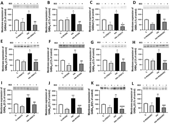 Hyperammonemia increases the membrane expression of GABAA receptor subunits α2, γ2, and β3 in the cerebellum. Ex vivo treatment with ANA12, R7050, JTE-013, or RS504393 reverses these increases. The membrane expression of GABAA (A–D) α2, (E–H) γ2, and (I–L) β3 in the cerebellum was analyzed using BS3 cross-linker procedure in slices from control (C) and hyperammonemic (HA) rats. The effects of blocking TrkB with ANA12, TNFR1 with R7050, S1PR2 with JTE-013, and CCR2 with RS504393 on membrane expression of this subunits of GABAA receptor are also shown. Values are the mean ± SEM of 15–24 rats per group. Values significantly different from control rats are indicated with asterisks, and from hyperammonemic rats are indicated with “a”. * p < 0.05, ** p < 0.01, *** p < 0.001; aa p < 0.01, aaa p < 0.001, aaaa p < 0.0001. (A–L) F values were 5.761, 5.959, 10.34, 8.885, 6.042, 7.936, 5.989, 6.573, 8.996, 12.06, 10.77, and 8.563, respectively. Data were analyzed using one-way analysis of variance (ANOVA) followed by Tukey’s post hoc test.