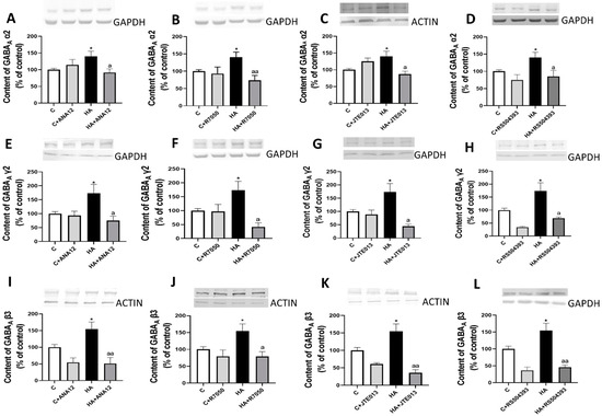 Hyperammonemia increases the content of GABAA receptor subunits α2, γ2, and β3 in the cerebellum. Ex vivo treatment with ANA12, R7050, JTE-013, or RS504393 reverses these increases. The total content of GABAA receptor subunits (A–D) α2, (E–H) γ2, and (I–L) β3 in the cerebellum of control (C) and hyperammonemic (HA) rats was analyzed with Western blot. The effects of blocking TrkB with ANA12, TNFR1 with R7050, S1PR2 with JTE-013, or CCR2 with RS504393 on the content are also shown. Values are the mean ± SEM of 18–26 rats per group. Values significantly different from control rats are indicated with asterisks, and from hyperammonemic rats are indicated with “a”. * p < 0.05; a p < 0.05, aa p < 0.01. (A–L) F values were 3.825, 5.274, 4.670, 5.303, 3.753, 3.720, 3.805, 5.340, 7.284, 4.487, 6.564, and 7.261, respectively. Data were analyzed using one-way analysis of variance (ANOVA) followed by Tukey’s post hoc test.