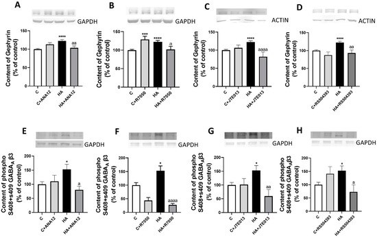 Hyperammonemia increases the content of gephyrin and the phosphorylation of the β3 subunit of the GABAA receptor in the cerebellum. This is reversed by blocking TrkB, TNFR1, S1PR2 or CCR2. (A–D) Gephyrin content and (E–H) the phosphorylation of the β3 subunit of the GABAA receptor in the cerebellum of control (C) and hyperammonemic (HA) rats were analyzed with Western blot. The effects of blocking TrkB with ANA12, TNFR1 with R7050, S1PR2 with JTE-013, or CCR2 with RS504393 on the content are also shown. Values are the mean ± SEM of 15–20 rats per group. Values significantly different from control rats are indicated with asterisks, and from hyperammonemic rats are indicated with “a”. * p < 0.05, *** p < 0.001, **** p < 0.0001; a p < 0.05, aa p < 0.01, aaaa p < 0.0001. (A–H) F values were 10.13, 12.54, 13.19, 14.37, 4.059, 12.25, 4.927, and 4.183, respectively. Data were analyzed using one-way analysis of variance (ANOVA) followed by Tukey’s post hoc test.