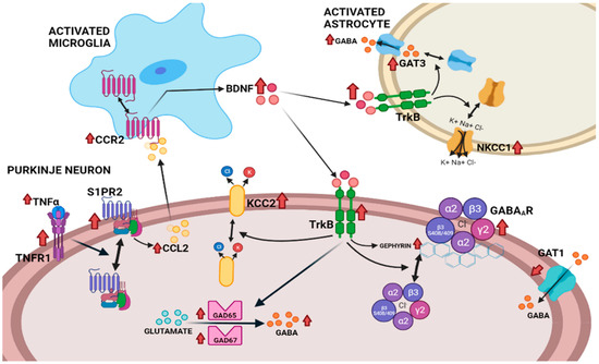 We showed that, in hyperammonemic rats, neuroinflammation leads to an increase in BDNF content in the cerebellum, which mainly occurs in activated microglia and is mediated by the activation of the tumor necrosis factor receptor 1 (TNFR1)–sphingosine-1-phosphate receptor 2 (S1PR2)–C-C chemokine receptor type 2 (CCR2) pathway [46]. BDNF may modulate GABAergic neurotransmission at different levels. BDNF modulates the amount in the cell membrane of GABAA receptor subunits and of KCC2 [43]. BDNF also upregulates membrane expression of GABA transporter GAT1 in cultured neurons [47] and increases the transcription of GAD65 [48].