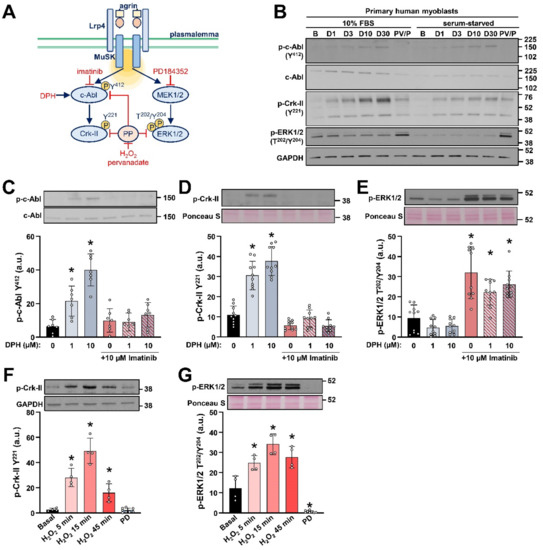 Detection of c-Abl signalling in primary human myoblasts. (A) Schematic overview of c-Abl and ERK1/2 signalling from the Lrp4/MuSK receptor complex (based on: [9,10,43,46,63,64]) and the sites of action of DPH, imatinib, PD184352, H2O2, and pervanadate. P: analysed phosphosites; PP: protein phosphatases. (B) Primary human myoblasts (from a 29 year (29Y) old donor) were treated with vehicle (Basal—B) or 1–30 µM DPH (D1-D30) for 4 h or co-treated (PV/P) with 100 µM pervanadate (20 min) and 1 mM H2O2 (15 min) in absence or presence of serum (10% FBS). Activity of c-Abl and ERK1/2 was estimated by measuring the phosphorylation c-Abl (at Tyr412), Crk-II (at Tyr221), and ERK1/2 (at Thr202/Tyr204). Both experiments were performed in duplicate. (C–E) The phosphorylation of (C) c-Abl (at Tyr412), (D) Crk-II (at Tyr221), and (E) ERK1/2 (at Thr202/Tyr204) in primary human myoblasts treated with DPH (1 or 10 µM, 4 h) and/or imatinib (10 µM, during final 30 min) in the serum-free medium. Results are means ± SD, n = 10 wells (3 donors: 5Y, 65Y, and 77Y) except for phospho-c-Abl where n = 7 wells (2 donors) because in myoblasts of one donor the phosphorylation was below detection level. (F,G) The phosphorylation of (F) Crk-II (at Tyr221) and (G) ERK1/2 (at Thr202/Tyr204) in human myoblasts treated with 1 mM H2O2 (5–45 min) or 10 µM PD184352 (1 h, PD) in the serum-free medium. Results are means ± SD, n = 4 wells (2 donors: 6Y and 80Y) except for PD184352 where n = 8 (2 donors). * p < 0.05 vs. Basal (B) or as indicated.