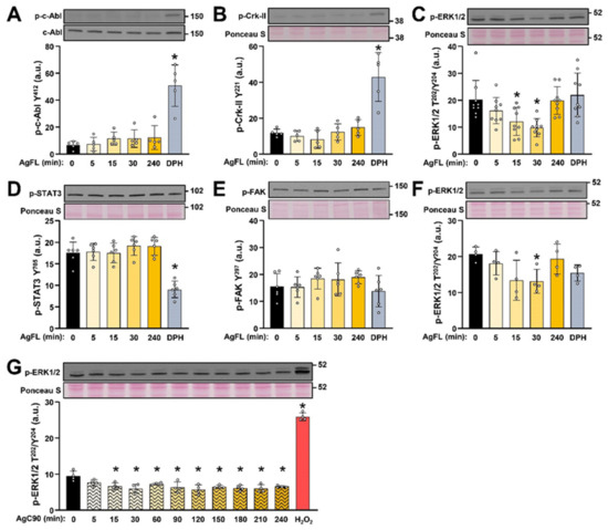 AgFL transiently suppresses the phosphorylation of ERK1/2 in primary human myoblasts. (A–E) Myoblasts were treated with 1 nM AgFL for 5–240 min and 10 µM DPH for 240 min in the serum-free medium. Activity of c-Abl, ERK1/2, JAK/STAT, and FAK pathways was estimated by measuring the phosphorylation of (A) c-Abl (at Tyr412), (B) Crk-II (Tyr221), (C) ERK1/2 (Thr202/Tyr204), (D) STAT3 (Tyr705), and (E) FAK (at Tyr397). Results are means ± SD, n = 5 donors (7Y, 7Y, 8Y, 15Y, 65Y) except for ERK1/2, where n = 9 donors (7Y, 7Y, 8Y, 12Y, 15Y, 17Y, 65Y, 67Y, and 77Y). (F) The phosphorylation of ERK1/2 (at Thr202/Tyr204) in myoblasts treated with 1 nM AgFL for 5–240 min and 10 µM DPH for 240 min in the presence of 10% FBS. Results are means ± SD, n = 4 donors (15Y, 17Y, 22Y, and 65 Y). (G) The phosphorylation of ERK1/2 (Thr202/Tyr204) in myoblasts treated with 1 nM AgC90 for 5–240 min or 1 mM H2O2 for 15 min. Results are means ± SD, n = 4 wells (2 donors: 5Y and 80Y). * p < 0.05 vs. Basal.
