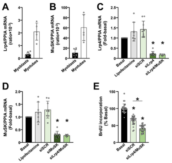 The Lrp4/MuSK agrin receptor complex is required for proliferation of primary human myoblasts. (A,B) Expression of mRNA for Lrp4 and MuSK in primary human myoblasts was determined using qPCR. Myotubes were used as positive controls. Endogenous control: cyclophilin A (PPIA). Gene expression ratios are reported as means ± SD, n = 8 donors for myoblasts and n = 5 donors for myotubes. (C–E) Myoblasts were transfected with scrambled siRNA (siSCR) or siRNAs against Lrp4 and/or MuSK. Untreated (Basal) and Lipofectamine-treated myoblasts were used as additional controls. The mRNA expression of (C) Lrp4 and (D) MuSK was estimated using qPCR. Endogenous control: PPIA. Gene expression ratios are reported as means ± SD, n = 7–9 wells (3 donors: 5Y, 44Y, and 80Y) except for the single knock-down of Lrp4 or MuSK, where n = 4 wells (1 donor: 7Y). (E) The BrdU incorporation in untreated myoblasts (Basal) and in myoblasts transfected with the scrambled siRNA (siSCR) or a pool of siRNAs against Lrp4 and MuSK (siLrp4/MuSK). Results are means ± SD, n = 28 wells (3 donors: 5Y, 44Y, and 80Y). * p < 0.05 vs. Basal or as indicated.