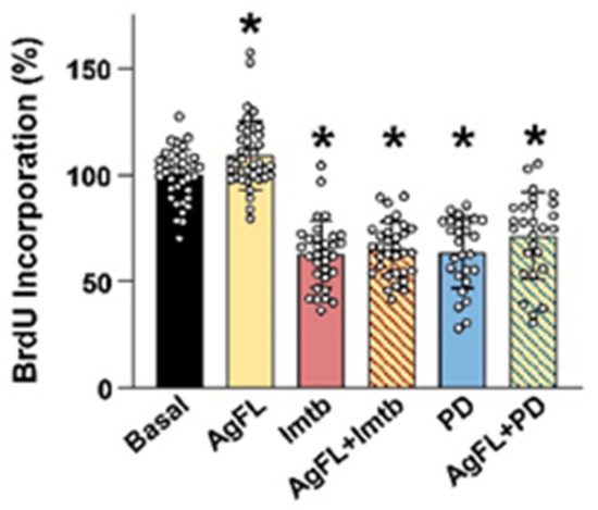 Effect of AgFL on proliferation of primary human myoblasts. Primary human myoblasts were treated with 1 nM AgFL for 24 h in the presence or absence of 10 µM imatinib or 1 µM PD1843521. Myoblast proliferation was estimated by measuring the incorporation of BrdU. Results are means ± SD, n = 39 wells (6 donors: 5Y, 7Y, 12Y, 13Y, 60Y and 66Y) for Basal and AgFL, n = 32 wells (6 donors: 5Y, 7Y, 13Y, 60Y, 60Y, and 66Y) for imatinib and imatinib + AgFL, n = 27 wells (4 donors: 5Y, 7Y, 13Y, and 66Y) for PD1843521 and PD1843521 + AgFL. * p < 0.05 vs. Basal.