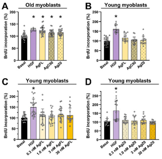 The BrdU incorporation in old myoblasts was increased by AgFL, AgC90, AgZ0 as well as by HGF (Figure 5A). Conversely, when myoblasts from a young donor were treated with 1 nM AgFL, AgC90, or AgZ0 the BrdU incorporation remained unaltered, although it increased in response to HGF (Figure 5B). In myoblasts of young donors, the incorporation of BrdU remained unaltered even when AgFL (Figure 5C) or AgZ0 (Figure 5D) were used in a range of 0.3–30 nM. On the one hand, these results indicated that the age-dependent effect of AgFL in promoting myoblast proliferation was mediated by Lrp4/MuSK pathway, on the other they unveiled a second signalling mechanism which remains to be investigated.