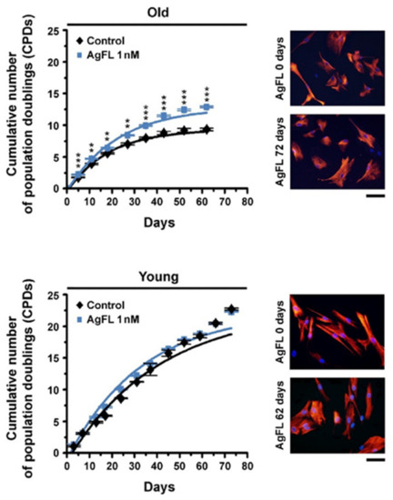 Age-dependent effect on AgFL on cumulative number of population doublings. Results are means ± SEM, n = number of Petri dishes, ** p < 0.01; *** p < 0.001 (Student’s t-test).