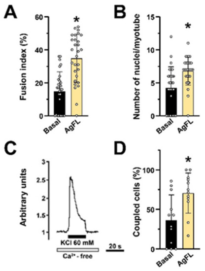 Sustained proliferation may impair the myogenic differentiation [33,34,35]. We examined whether AgFL-treated myoblasts retained the capability to differentiate despite the enhanced proliferation. The AgFL-treated myoblasts from a 60-year-old donor were induced to differentiate by reducing the serum concentration (see Materials and Methods for details). After 10 days of differentiation, we determined fusion efficiency and the establishment of the skeletal-type e–c coupling mechanism, based on the mechanical link between L-type voltage-operated Ca2+ channels and ryanodine receptors [82,83]. Fusion efficiency was evaluated by estimating the fusion index and the number of nuclei per myotube. The fusion index was higher in the AgFL-treated than in the control cells (Figure 7A) as well as the mean number of nuclei per myotube (Figure 7B). The establishment of the e–c coupling mechanism was assessed by Ca2+ imaging [84], i.e., measuring the number of cells in which a Ca2+ transient was elicited by depolarisation (KCl 60 mM) in Ca2+-free conditions (2 mM EGTA excess) (Figure 7C). The percentage of myotubes (± SD) exhibiting a skeletal-type e–c coupling mechanism (Figure 7D) was higher in cultures derived from the AgFL-treated myoblasts than in controls.