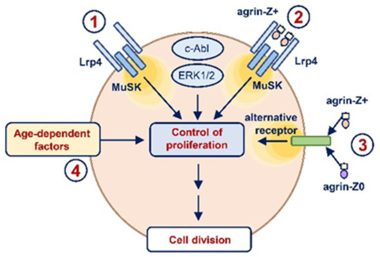 - Stimulation of proliferation by neuronal agrin likely involved Lrp4/MuSK-dependent as well as Lrp4/MuSK-independent pathways.