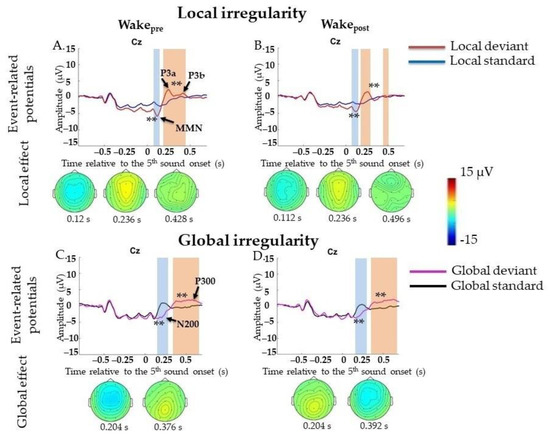 - Strauss, M.; Sitt, J.D.; King, J.-R.; Elbaz, M.; Azizi, L.; Buiatti, M.; Naccache, L.; van Wassenhove, V.; Dehaene, S. Disruption of Hierarchical Predictive Coding during Sleep. Proc. Natl. Acad. Sci. USA 2015, 112, E1353–E1362. [Google Scholar] [CrossRef] [PubMed]