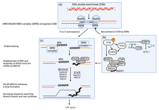 Schematic of DNA double-strand break (DSB) repair by homologous recombination (HR) and key molecules: MRE-RAD50-NBN (MRN) protein complex, ATM, BARD, BRCA1, BRCA2, BRIP1, CHEK2, PALB2, and RAD51C/D. The free DNA ends produced by DSBs are recognized by the MRN protein complex (a). The MRN protein complex recruits and activates ATM, which in turn phosphorylates and activates many downstream targets essential for DNA damage repair via nonhomologous end-joining (NHEJ) and HR (b,c). The replication protein A (RPA) is recruited by the BRCA1–PALB2–BRCA2 effector complex and is loaded on a long 3′ single-stranded DNA (ssDNA) tail to form RAD51–ssDNA nucleofilament. BRCA2 mediates displacement of RPA with RAD51. PALB2-BRCA2 enhances D-loop formation, which is followed by HR repair. The RAD51 paralogs associated in protein complexes (RAD51B-RAD51C-RAD51D-XRCC2 (BCDX2) and RAD51C-XRCC3 (CX3)) participate in the assembly and stabilization of the ssDNA/RAD51 filament and the HR intermediates as well as in the steps downstream of the homology search (not represented) [56].