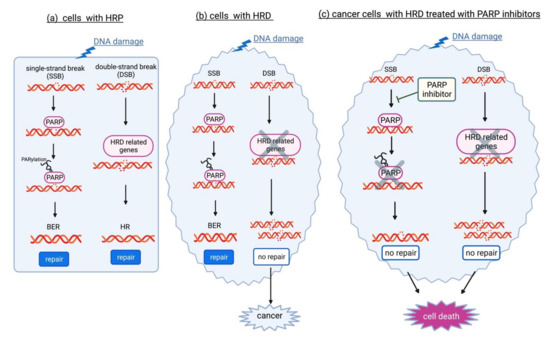 The multifunctional enzyme Poly ADP ribose polymerase (PARP) plays an important role in DNA damage repair and genome stability. Among the 18 members of the PARP family, PARP-1 is the most important and plays dominant roles in DNA repair pathways. Activated PARP-1 plays an important role in DNA base excision repair (BER) [57]. When PARP-1 fails to function, oxidized bases accumulate. The replication fork stops at the site of the damaged DNA, eventually resulting in DSBs. In normal cells which are proficient at HR (HR proficiency, HPR), both BER and HR are available for the repair of damaged DNA (Figure 2a). Meanwhile, in cells with HR deficiency (HRD), HR is nonfunctional and leads to carcinogenesis (Figure 2b). When PARP-1 is inhibited by PARP inhibitor, cancer cells with HRD are unable to repair DNA damage by HR and BER, leading to cell death (synthetic lethality, Figure 2c). PARP-1 is also involved in the regulation of nucleotide excision repair (NER), classical NHEJ (cNHEJ), alternative NHEJ (aNHEJ), microhomology-mediated end-joining (MMEJ), HR, MMR, and maintenance of replication fork stability [58]. For example, PARP-1 recruits DSB repair enzymes MRE11 and NBS1 for modulating DSB repair [59].
