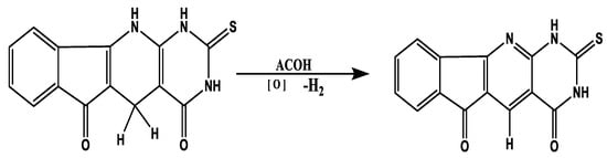 The novel thiouracil-based indeno pyrido pyrimidines TUIPP, which contain an additional sulfur atom, were chosen for this study, when compared with its analogous, uracil-based indeno pyrido pyrimidine UIPP derivatives [], which contain only oxygen and nitrogen atoms as heteroatoms based on the proven outstanding biological activity of the latter. The former are expected to exhibit even better antitumor activities than UIPP. TUIPP and UIPP can exist in the dihydro and oxidized forms in the cell tissues, as shown in Figure 1, which shows the oxidation of compound 1H to compound 1O.