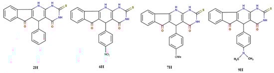 The 2D structure of the four thiouracil based dihydro-indenopyridopyrimidines (TUDHIPP) derivatives (2H, 6H, 7H, and 9H).