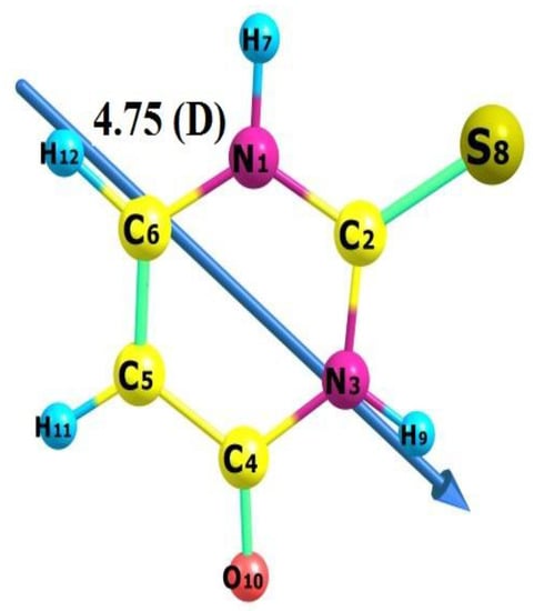 Optimized geometry, numbering system, vector of dipole moment of thiouracil.