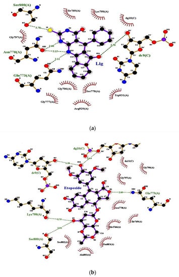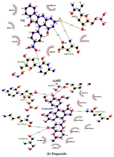 (a) Binding sites and interactions of 6H with human DNA topoisomerase IIβ, 3qx3; (b) Binding sites and interactions of etoposide with human DNA topoisomerase IIβ, 3qx3.
