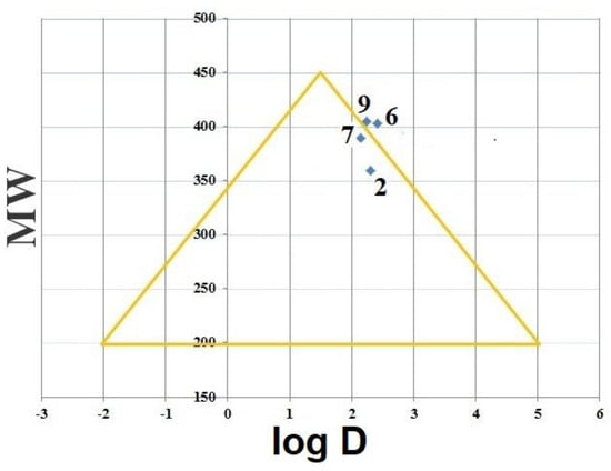 A useful visualization tool of the Golden Triangle was developed by Johnson and co-workers [], which relates molecular weight (MW) and lipophilicity (Log D at pH 7.4; log D7.4). The golden triangle is considered as a container for many different molecular descriptors. This means that compounds that are located inside the Golden Triangle are more likely to be both metabolically stable and to possess good membrane permeability than those outside. Although the Golden Triangle is computed for the nine compounds 1H–9H, its applicability will be demonstrated for the compounds considered 2H, 6H, 7H, and 9H. The Golden Triangle (Figure 6) shows that compound 9H is located outside the triangle, indicating poor permeability and clearance. On the other hand, compounds 2H and 7H were located inside the triangle, indicating better permeability and clearance [].