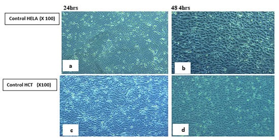 Control (untreated) human HELA and HCT cell lines. Panels (a,c) show 90% confluent, spindle shaped adherent cells 24 h after culturing. Panels (b,d) show confluent spindle shaped adherent cells, 48 h post-culture. (Phase contrast, 100×).