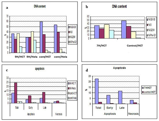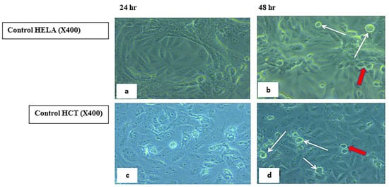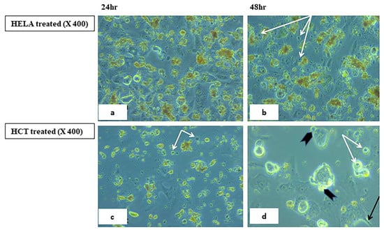Morphological analysis with phase contrast is one of the best methods to determine apoptosis [], which is one of the main objectives for cancer therapy []. Morphological and biochemical alterations of apoptotic cells include cell shrinkage, nuclear condensation and fragmentation, membrane blebbing [], and the formation of apoptotic bodies in addition to the loss of attachment to neighboring cells []. Biochemical changes in apoptosis include chromosomal DNA cleavage into inter-nucleosomal fragments, the externalization of phosphatidylserine, and the proteolytic cleavage of intracellular substrates []. Changes in the HCT and HeLa cell lines were analyzed after 24 and 48 h incubation with 7H and 9H using the IC50 doses. Features of activated apoptotic pathways as well as anti-growth effects were noted. Regarding the control (untreated) cells, they maintained their original morphology of having a spindle shaped appearance and most of them were adherent to the tissue culture dish substratum. Nearly 90% confluent adherent cells 24 h after culturing were demonstrated in Figure 8a,c, with the cell confluency relatively increased after 48 h, as shown in Figure 8b,d. Closer observation of the control cells showed vesicular nuclei, prominent nucleoli, and granular cytoplasm, as shown in Figure 9. Few rounded floating cells were observed, which represent those newly divided. Others were rounded and adherent, which represented divided attached cells (Figure 9b,d). The same features were described in previous studies [,]. On the other hand, after 24 h incubation of 9H, the culture cells became less confluent spindle shaped with some rounded or polygonal cells when the concentration of the extract was increased, as shown in Figure 10a,c. A total of 50% confluent spindle shaped cells with few rounded floating cells were recruited (Figure 10d).