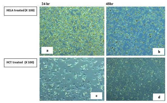 Human HELA and HCT treated cell lines 24, 48 h from incubation with 9H. Panels (a,c) show non confluent spindle shaped cells with unhealthy floating cells. Panel (b) shows 50% confluent spindle shaped cells with few rounded floating cells with an increase in the concentration of the extract. Panel (d) shows numerous cellular debris with few spindle shaped cells compared to (c). Phase contrast, 100×.