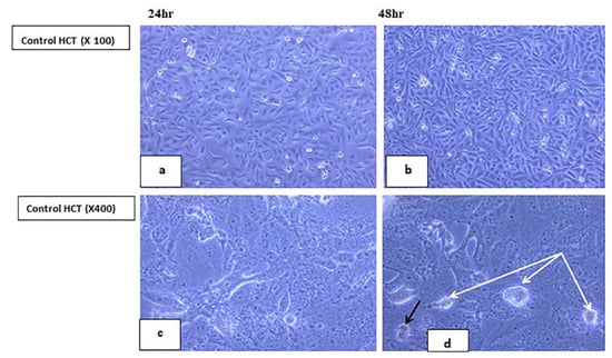 Control (untreated) human HCT cell lines. Panels (a,b) show spindle shaped attached cells. Panel (b) shows 90% confluent spindle shaped cells 48 h post culture. Phase contrast, 100×. Panels (c,d) show spindle shaped attached cells with vesicular nuclei and granular cytoplasm and also some polygonal cells with multiple processes. Panel (d) shows, in addition, rounded floating cells (white arrows) and dividing cells 48 h post culture (black arrow). Phase contrast, 400×.