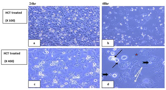 Showing HCT treated human cell lines 24, 48 h after incubation with 7H. Panel (a) shows 80% confluent spindle shaped cells and rounding floating cells. Panel (b) shows 40% confluent spindle shaped cells with an increase in the concentration of the extract 48 h post-culture. Phase contrast, 100×. Panel (c) shows 70% confluent branched adherent cells with vesicular nuclei, granular cytoplasm, and some rounded floating cells (mostly dead cells). Panel (d) shows less confluent polygonal cells, with rounded nuclei and very granular cytoplasm with fewer processes. Notice the rounded floating dead cells and the apoptotic features 48 h post-culture such as cell shrinkage and pyknotic bodies of condensed chromatin (head arrows), membrane blebbing (black arrows), and echinoid spike (star). Phase contrast, 400×.